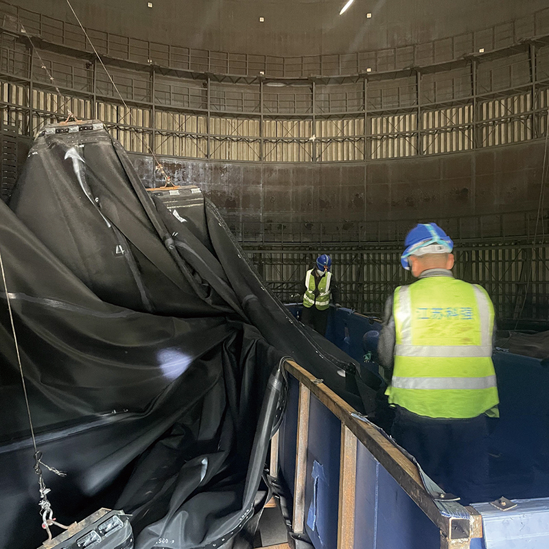 氣柜橡膠密封膜安裝于威金斯氣柜,該類型氣柜又稱柔膜密封型煤氣柜或者卷簾密封煤氣柜,由美國人約翰·威金斯 (JOHNWIGGINS)創造,1940年在美國建造了首臺(容積為1480m)。外形是圓筒形,活塞與罐體之間連有可撓性的膠膜密封簾,膠膜隨活塞上下移動而卷起或放下,達到密封目的。